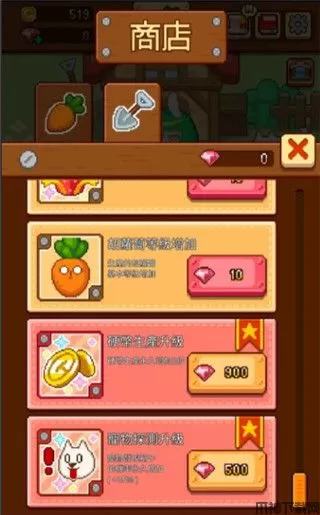 2、玩家除了可在商店购买红萝卜之外,也可透过达成游戏中成就所获得的宝石来强化。特别是提升红萝卜初期等级的强化,可以让玩家少点很多次,手比较不会发炎。等玩家有足够金币时还可以购买新的农场,培育的新农作物。