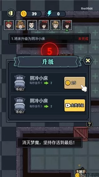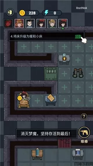 2、升级优先度:找好宿舍后优先提升床的等级和建造两个炮台,因为这个时候猛鬼还没有到来,所以优先提升床铺的等级快速获取金币,然后再去提升门的等级,之后床铺的等级可以暂停一下,优先提升门的等级,否则很容易被猛鬼突破,提升到需要电力的时候再去商店购买游戏机,否则会很容易被猛鬼突破。