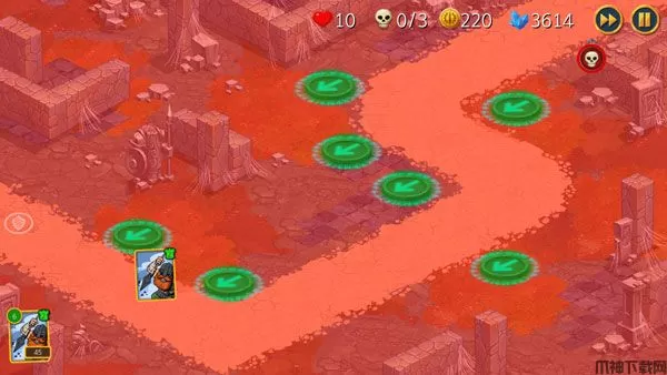 2、该游戏在基础的塔防玩法下没有什么根本性的变化,只有你能成功抵御怪物的路线入侵即可挑战成功,但游戏的独特性在于这里的防御采用了卡片形式,玩家们则需要根据已有的卡片来部署塔防,塔和炮塔代表战士,弓箭手保卫你的宝座。