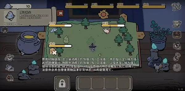 概括起来就是:旅行是长按童话书的书签,消耗大量的饥饿、口渴、体力,恢复理智并移动到新地块上。休息是长按童话书的日月,消耗少量饥饿、口渴,恢复一定数值的体力同时停留在原地。但无论是旅行或是休息,都会度过一段时间(即切换昼夜)。所以说,让小猫咪走走停停,劳逸结合,才是在黑森林里寻找道路的正确姿势哦!
