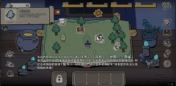 右侧第二个羊皮纸形状的按钮是“任务”按钮。除了起始任务外,玩家也会在黑森林中碰到一些NPC,跟他们对话,或者满足一定的条件,也能够触发他们的任务。第三个按钮是“背包”,第四个按钮是“地图”,第五个按钮是“图鉴”,第六个按钮是“设置”这几个按钮相信玩家在看过前面的讲解后,应该已经知道如何使用了~