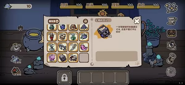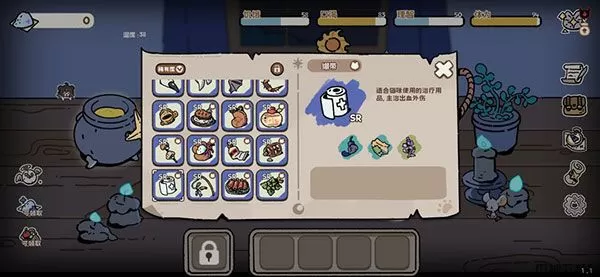 最后说一下游戏里我们为玩家便利设计的小按钮。右上角第一个小猫形状按钮是“状态与天赋”,点击后可以看到猫猫携带的初始天赋与当前的状态,一些buff/debuff都能在状态栏中直观展示(还有一些游戏的小tips!)。天赋则是每次开局需要使用猫须点亮的增益,虽然只有当局有效,但一般都效果显著!另外:每次新开局都会赠送10点猫须,记得要使用哦!