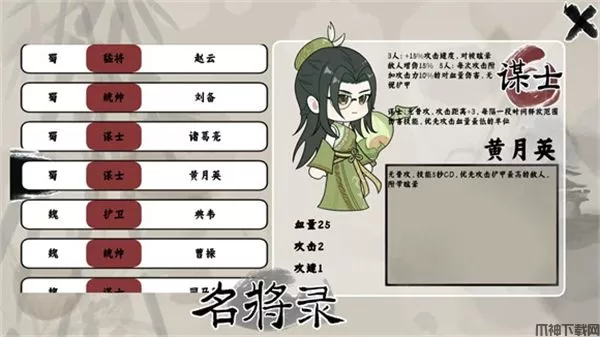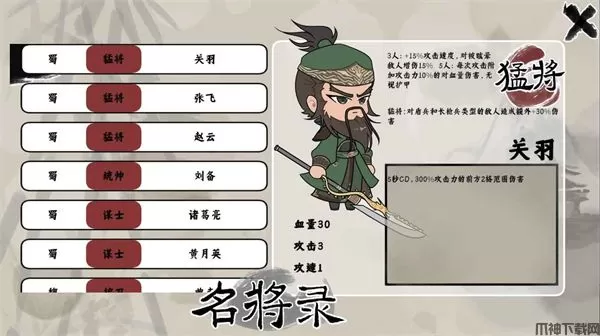 2、还可以进入名将录中,里面有不同的武将,比如赵云、关羽等,每个武将都有不同的技能,以及绝招。