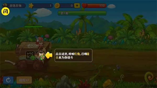 2、开始战斗,点击下方号角召唤战斗和使用弓箭开始攻击;