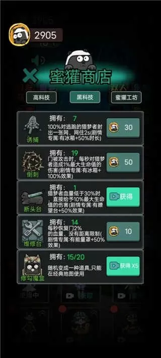 到蜜罐商店去购买道具,必买道具就是黑科技里的维修台和能量罩,维修台+能量罩,维修台增加50%的效果,其他选择关卡需要的进行购买,注意商城有可以通过观看视频获取房门升级卡,还有修勾魔盒(可以随机变成一种道具在剧情中使用,也可以用来免费升级炮塔)。