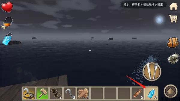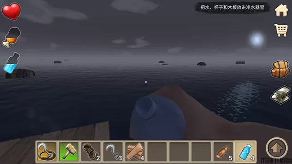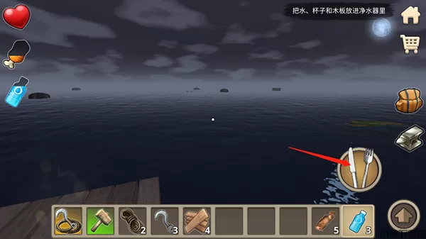1、开局时用钩子收集资源,注意不要漏木桶,勾不到就下水捞,先造杯子和煮水器,然后造炉子和鱼竿。