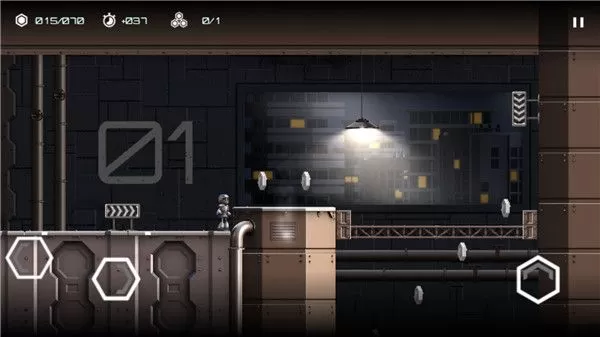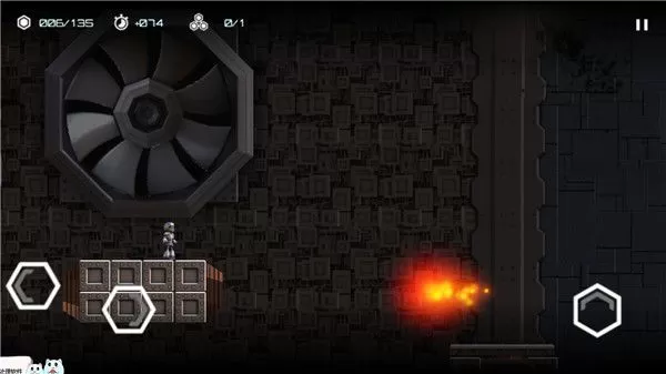 3、游戏在有三个按钮,左边2个按钮控制角色移动,而右边的按钮控制跳。双击跳跃可以进行两段跳,在这个过程会遇到很多不同的阻碍如机器蜘蛛等,这些阻碍和陷阱都会可能会让你措手不及哦呢,但在操作上并不是一款难的问题,玩家可以轻松上手。