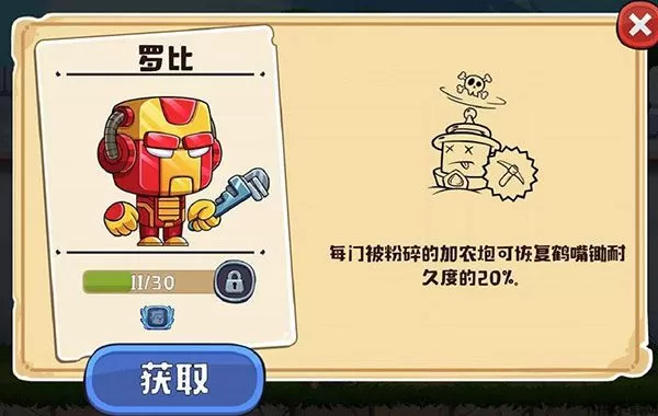技能:每门被粉碎的加农炮可恢复鹤嘴锄20%的耐久度