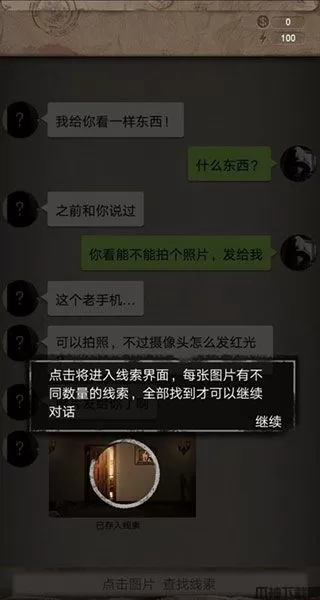 2、在聊天过程中,对方会发送一些图片,每张图片都是案发的一些场景,里面都隐藏着线索,找出线索才可以继续对话,推动剧情。我们点击图片可以进入线索场景。