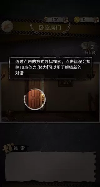 3、线索的查找是通过点击的方式,点击错误会扣除我们的体力,我们的初始体力是100点,线索寻找错误会扣除10点。