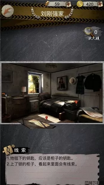 2、来到刘刚强家,找到2条线索。一是地毯下的钥匙,应该是柜子的钥匙;二是上了锁的柜子,看起来里面会有线索。