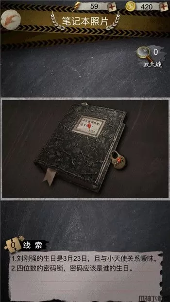 3、接着在笔记本照片上也发现2条线索。一是刘刚强的生日是3月23日,且与小天使关系暧昧;二是四位数的密码锁,密码应该是谁的生日。