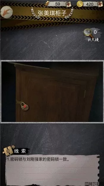 7、搜索张美琪柜子,发现密码锁与刘刚强家的密码锁一致。