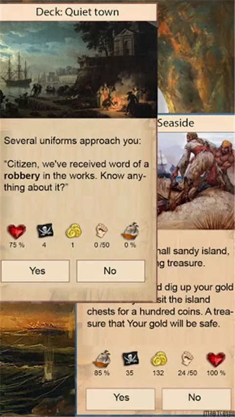 船长的选择是一款清新卡通风格的文字选择剧情类游戏,英文名为Captains Choice,游戏中采用了海盗为主题,中世纪的背景画面和时间线,非常清晰的游戏画面,让人有一定的剧情代入感。