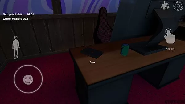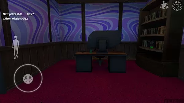 4、玩家可以通过左下角轮盘操控【角色移动】,左侧角色图标控制角色【站立蹲伏】,左上角倒计时表示下一轮的【NPC巡逻】。