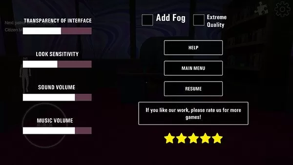 7、点击右上角齿轮图标,可以打开游戏的【暂停菜单】,调整游戏参数、查看帮助或者返回主菜单等。