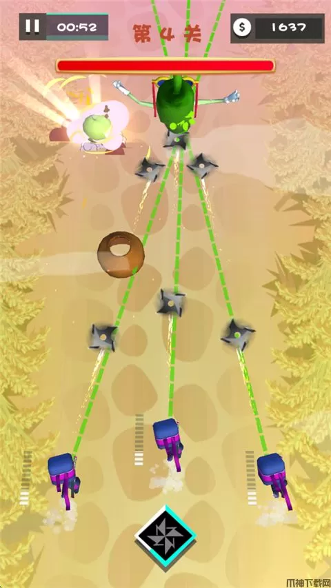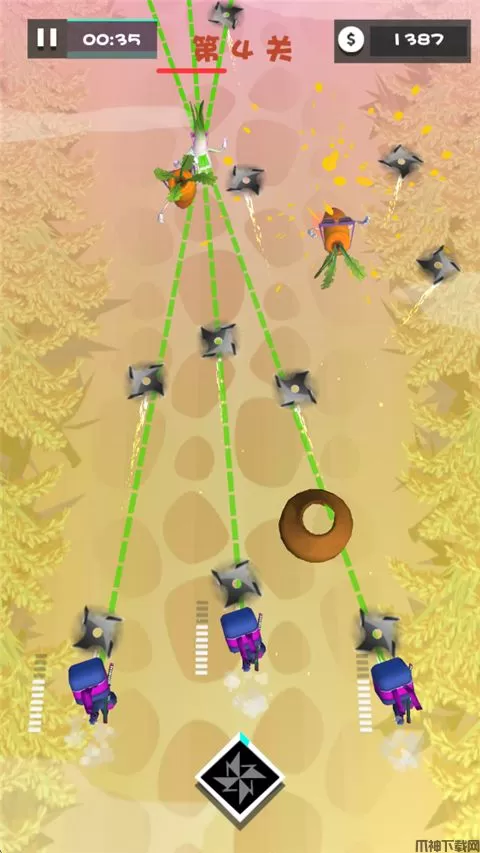 美食大作战是一款以跑酷为玩法的休闲闯关游戏。在游戏中,玩家操控3名忍者在关卡进行攻击道路的各种水果,只需要点击水果即可发起攻击,蓄力松开后释放忍术,能量满时可释放奥义。每一关拥有一个强大的水果BOSS,成功击败它可以获得大量金币奖励,通过金币可强化3名忍者的基础攻击,还可以升级手里剑、学习多种奥义忍术,帮助你更好的闯关!另外,游戏中攻击水果、蔬菜还有不同的打击动画效果,非常有趣。