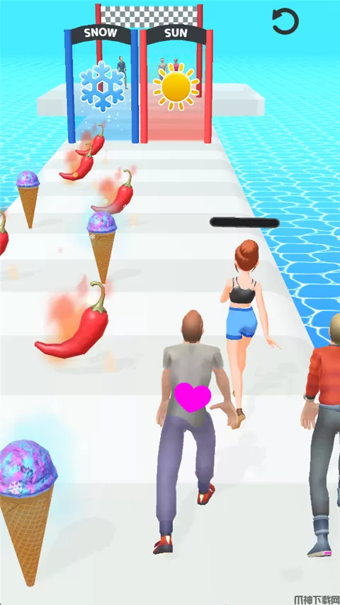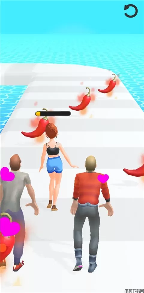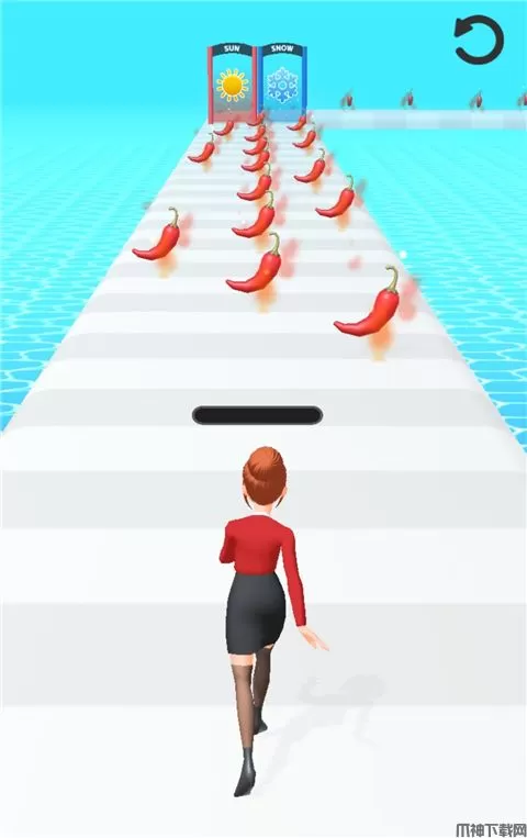2、在赛道上收集辣椒,当头上的进度条满了之后,会变身为更凉爽的装扮。