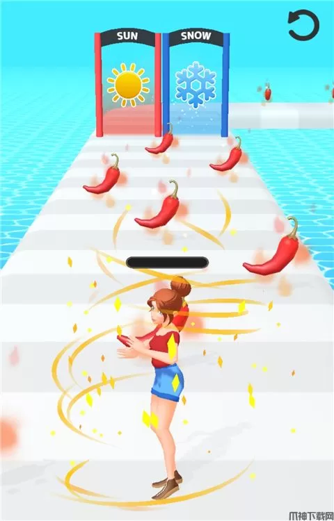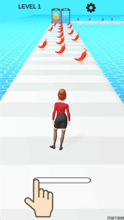 2、滑动屏幕左右移动角色,收集辣椒提升火辣指数,吸引男性角色围观。