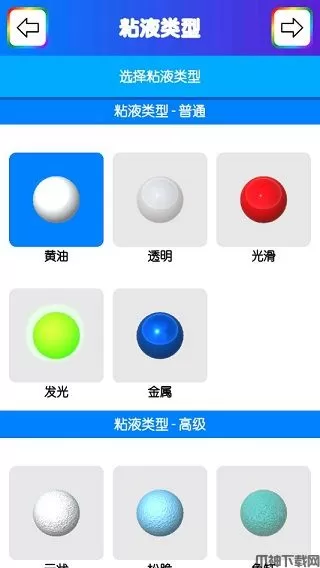 3、选择好之后,切换上方箭头进行下一级,在这里展示里年粘液类型,有黄油、透明、光滑、发光、金属,在高级粘液类型中,有云状、松脆、鱼缸、毛茸茸、闪闪发光、全息等等。