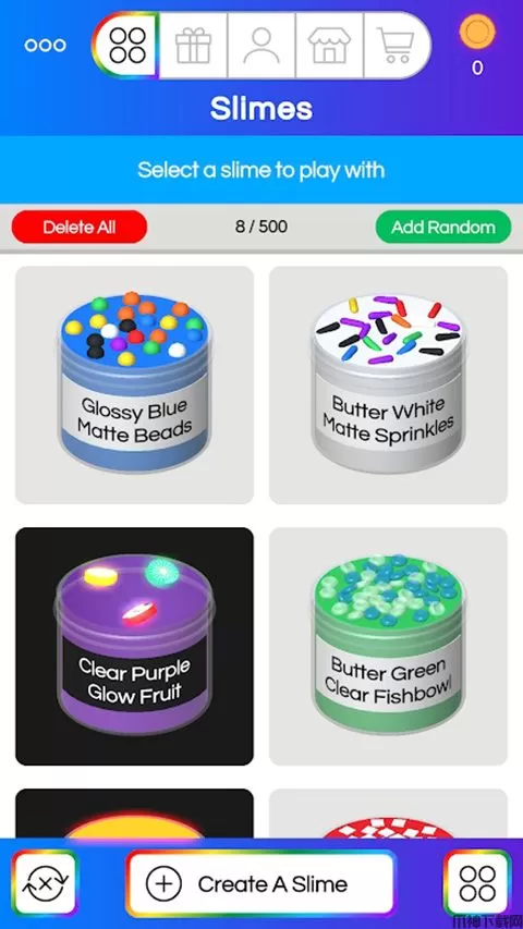 1、首先我们进入Virtual Slime游戏,你会看到如图所展示的画面,在这里共计500种粘液可以选择,此时我们点击下方“创建一个粘液”(左边可以刷新当前页面的粘液展示,右边是列表展示的切换按钮)。