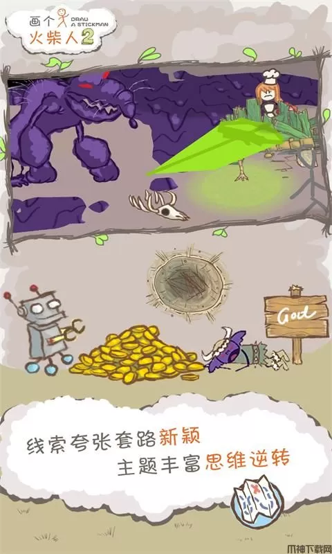 画个火柴人2是一款能够开发玩家创造能力的冒险手游,也是《画个火柴人》系列目前的最新作品,相比起前作,本作不仅在画面上有了升级,而且画笔种类更多了,增加了鸟蛋,电线,冰晶等要素,谜题的解决难度也随着元素的增多而递增。玩家在冒险期间能找到不同功能的画笔,为解谜过关提供巨大帮助。更有趣的是,玩家还可以通过探索隐藏路线,达成一定的成就来解锁更多游戏内未知的人物和华丽道具,让喜欢收集的玩家在主线剧情之余获得额外的惊喜。