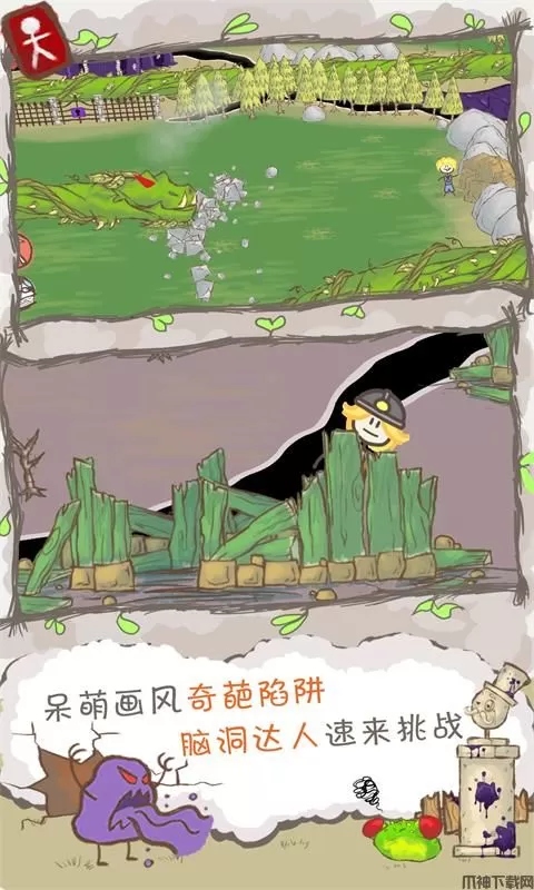 同时,画个火柴人2正版的操作方式简单,点击屏幕就能让火柴人前往到点击处或者与点击的场景道具互动。在一路上,玩家要收集各种不同特效的画笔来画出不同的物体,用来解开谜题。玩家也可以在关卡中可以获得各种画笔,可以通过这些功用不同的画笔画出攻击用的武器或攻击效果,比如第一关获得可以画树叶的笔,这在遇到一些泥潭类的地方可以在附近枯枝上画出一片绿色,消除掉附近的泥潭。后面还可以获得画出铁锹等武器,以过去各种障碍去到更多地方,就连所谓的敌人都是玩家自己构建出来的。随着你一路画着勇闯关卡,你将会探索各种不同环境,遭遇非同寻常的生物和陷阱,也面临着各种死亡挑战。总之,画个火柴人2正版游戏玩法高度自由,可以为玩家带来非得好的游戏体验感!