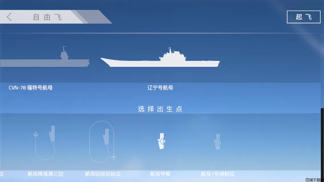 进入菜单后,可以选择自己喜欢的飞机,飞机初始内油量如果在执行降落任务时建议使用 默认油量,因为如果油量过多会使重量增大从而变得不灵活。 然后选择自己喜欢的航空母舰,接下来就是设置出生点,左右滑动可以获取更多出生位置,然后点击起飞即可开始游戏。