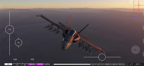 模拟器实现了基于真实 HUD 原理的 HUD。HUD 字符和符号的大小和视角均经过严格验证,符合对应真机的 HUD。这提供了移动市场上最真实的 HUD 实现。F18 目前配备了功能齐全的火控雷达,其他飞机的火控雷达也在开发中。