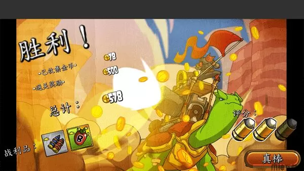 8、通关后可获得自动计算金币以及战利品,游戏还会对你的表现做出评价。