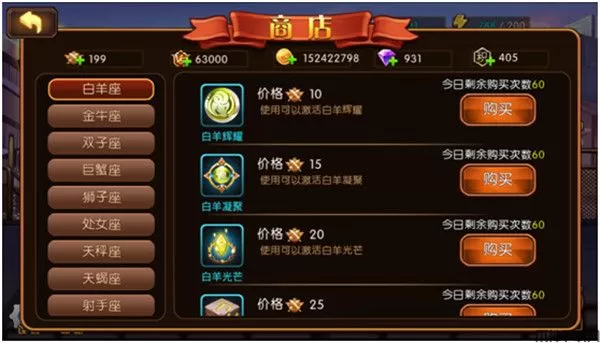 在商店购买材料也是有一个小技巧,每天购买的数量有限,如果你有很多的决斗币,你可以把各种星座材料的购买次数都用完,等到需要升级改星座的时候就非常方便。