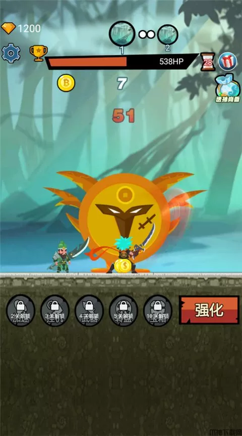 游戏中玩家只需要点击屏幕进行攻击,击败敌人还会获得金币,打到一定的金币后,玩家可以点击强化来升级和雇佣武将,玩家可以根据需求来选择升级的武将和需要雇佣的武将,玩家可以点击挑战头目来进行闯关,挑战成功即可进入下一关,需要注意的是游戏下方还有一个武器按钮,玩家可以点击武器来购买和升级武器,两个相同等级的武器可以进行合成升级,升级后玩家可以查看武器的属性。