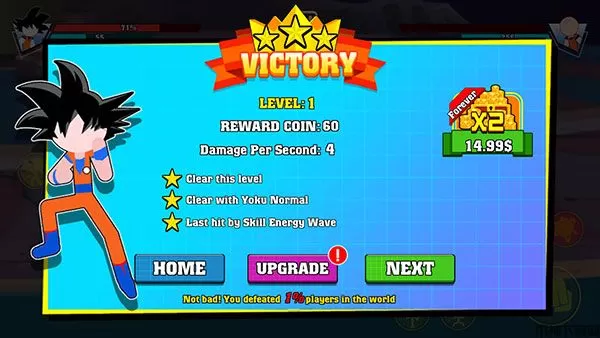 1、将你的火柴人完美的进行控制,达到一定的水平你就能得到游戏奖励哦。