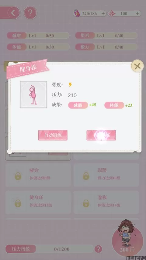 3、点击“回家”-“锻炼”从健身操开始,你可以自动或手动,当毅力达到相应的级数即可解锁更多的运动方式。