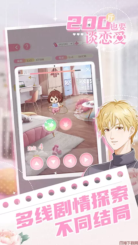 现在许多小伙伴们一边陷入身材焦虑不满足于现状,又苦于无法付诸行动。处于无法改变自己的同时又陷入无尽的内耗当中。鉴于此,小编特地为大家带来了200斤也要谈恋爱这款游戏,希望能够治愈人心又能给予小伙伴拥有改变自己的勇气。200斤也要谈恋爱是一款很好玩的模拟恋爱乙女向类型手游,游戏背景讲述的是成为作家是你自小的梦想,但是因为体型以及外表的原因,即便文笔优秀,拥有着一批忠实读者,与你签约的公司依然选择了另一位外形条件远高于你的美女作家作为你的形象代表。代替你出现在公众视野。遭遇欺骗、隐瞒、控制,你将作出如何的抉择?如果一切的阻碍是因为形象,那么就下定决心开始改变吧!漫长的减肥之路,在此过程中将与三位性格迥异的男主角邂逅展开一段恋爱与救赎的故事……