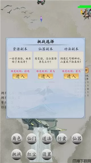 3、点击挑战,可以开启副本模式,共有资源副本、仙器副本、功法副本等