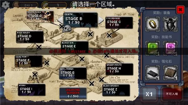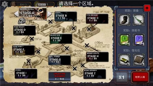 1、点击右边的大门,可以选择不同区域进行挑战
