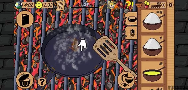 6、点击锅开始烹饪,按照菜谱要求,放入洋葱和蟑螂,再加入3勺糖,拖动锅铲进行翻炒,就可以了。