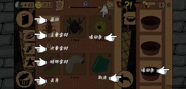 4、点击桌子上的食材框,左侧可以选择主要食材、次要食材以及特殊食材,在主要食材内找到蟑螂,点击3次,再在次要食材内找到洋葱,点击放入右侧的碗具内。