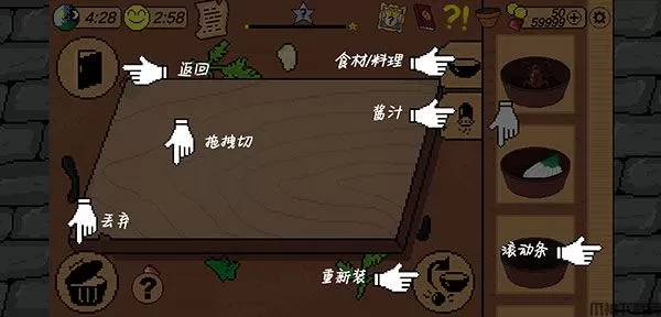 5、返回主页点击菜板,将右侧的食材拖动到左侧的案板上,滑动屏幕就可以进行切菜,还有不同的料汁可以选择进行腌制,完成点击图示右下角的“重新装”放入碗中,不需要的部分话可以点你左下角垃圾桶丢弃。