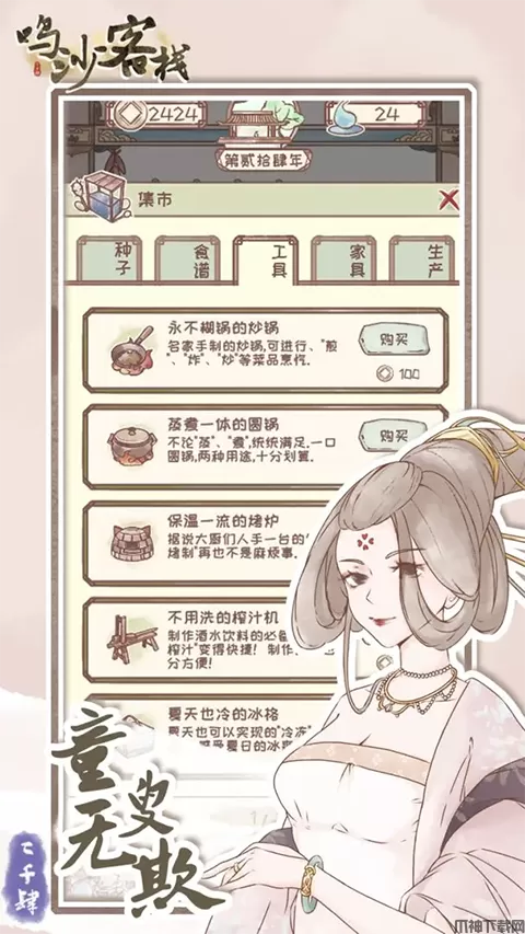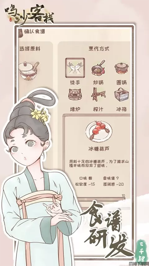 鸣沙客栈是一款厨房题材美食烹饪经营游戏,画面很有国风特色,研发各种美味的食物,可以自由组合所有的食材,成为美食大神,趣味的玩法模式,让你享受做饭,收菜的快乐。游戏中你会遇到各种各样的人物,可以跟NPC对话,解锁更多的剧情故事,还能招待客人,需要自己动手种植蔬菜。五大类可供选择,玩家可以自由操作客栈解锁更多任务,带你走入了古香古色的客栈,看世态炎凉风情万种。