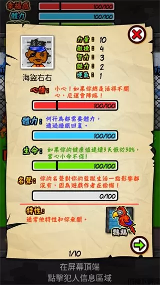 2、整个监狱关押着大约100名奇葩犯人,玩家如果想安全度过刑期,首先要面对的考验是其他犯人的欺辱:有的人张口就要钱,有的人看你不顺眼就要动拳头,如果你干了坏事还会有人来寻仇。如果是硬碰硬的冲突,玩家要和对手比拼力量、敏捷、智力等属性值或特殊技能的高低,成功与失败都会影响到幸福感、体力、健康值或金钱等维系生存的指数。如果不想起冲突,则要用一些特殊手段和各方势力打好关系。