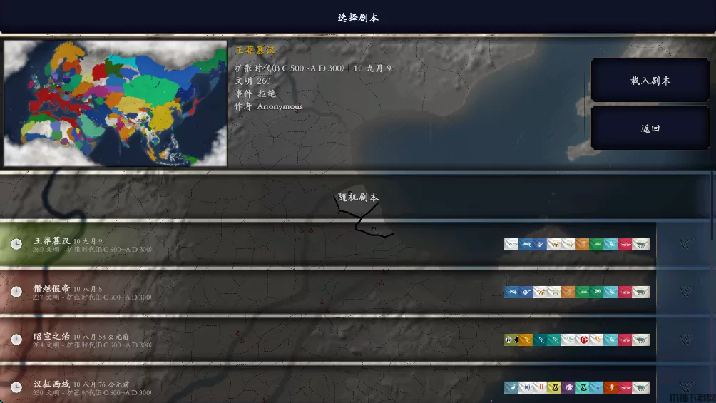 4、随后选择游玩历史剧本,拥有王莽篡汉,僭越假帝,昭宣之治等等剧本,