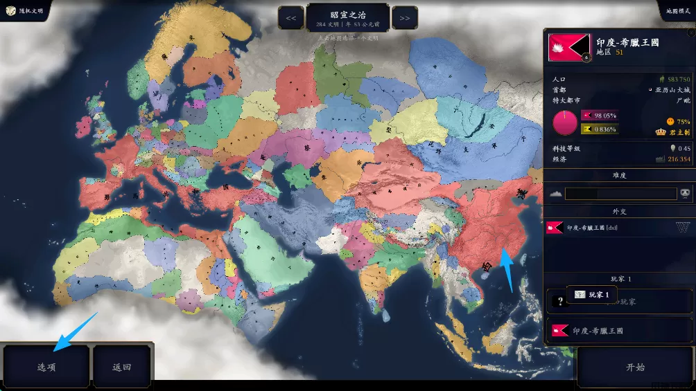 5、选择后,会随机选择一个国家作为玩家的操控国家级,如果我们需要自己选择游玩国家,可以再地图上自行点击该国家疆土,随后随手点开左下角的“选项”。