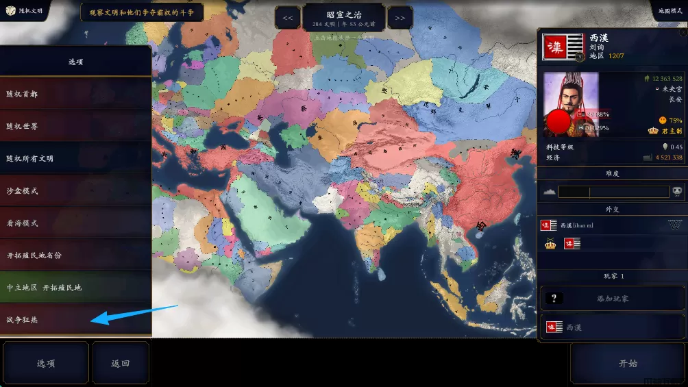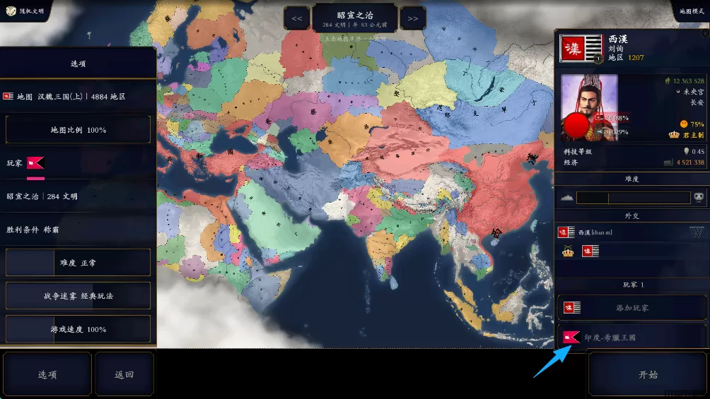 可以看到,这里原本是“印度 希腊王国”,但在地图上点击国家后,再点击后该处,就会变成“西汉”。(步骤7图可见)