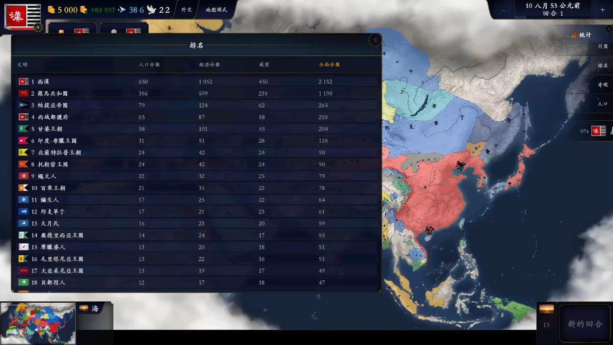 8、开局建议先看世界排行,注意哪些国家不可招惹,原来我们是“西汉”,那没事了,东进小岛,西征罗马,也是易如反掌。可能是游戏“特性”,文明时代一系列游戏都可以通过“交易请求”无限制让国A对国B进行宣战,当自己无法抵抗大国的进攻,可以通过该方法让多个国家一起对其宣战,本作实测,该方法依旧有效。