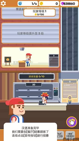 4、此时汉堡已经准备完毕,我们需要在餐厅招募顾客了,连续点击右下角的宣传按钮进行招募。