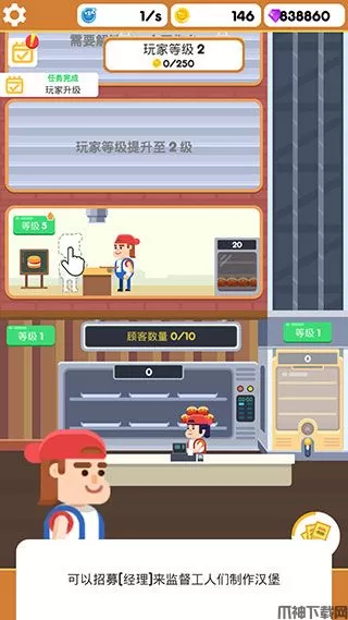 6、比如我们可以招募经理来监督工人们制作汉堡、进行售卖以及操控升降机等。
