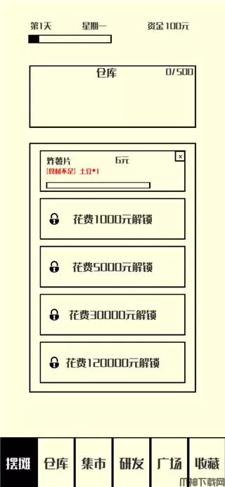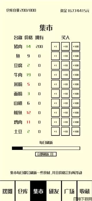 风味小吃官方版是一款极简风格的放置+模拟经营的小游戏,游戏在画面上采用了极简文字风格,画面简约,玩法丰富。开局玩家只有100块,需要在游戏中从装修店铺,购买食材、仓库调配等玩法上开始做起,不断颜研制出新的小吃,来吸引更多的客户,可以帮助自己获取更多的利润,来提升收益。期间,还可以经营你的小吃摊,运用策略让自己赚的更多。同时在风味小吃手游中玩家可以买很多食材,比如:猪肉、鱼、豆腐、牛肉、米粉、面粉、山楂、鱿鱼、鸡肉等等,并且还可以研发新的食材,提升厨艺可提高研发成功概率,厨艺可以通过提升小吃品质获取,若研发夫败也会获得厨艺哦。除此之外,风味小吃游戏支持后台挂机,但是不要在后台也关掉应用,不然就无法后台运行和保存数据了。喜欢的玩家还在等什么,快来下载体验一下试试看吧!
