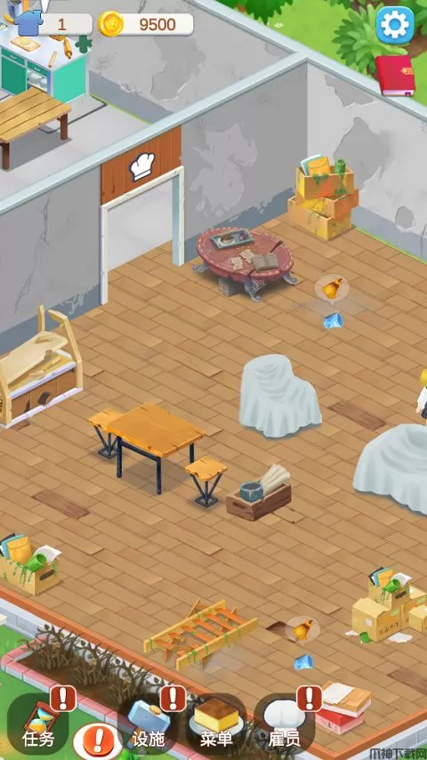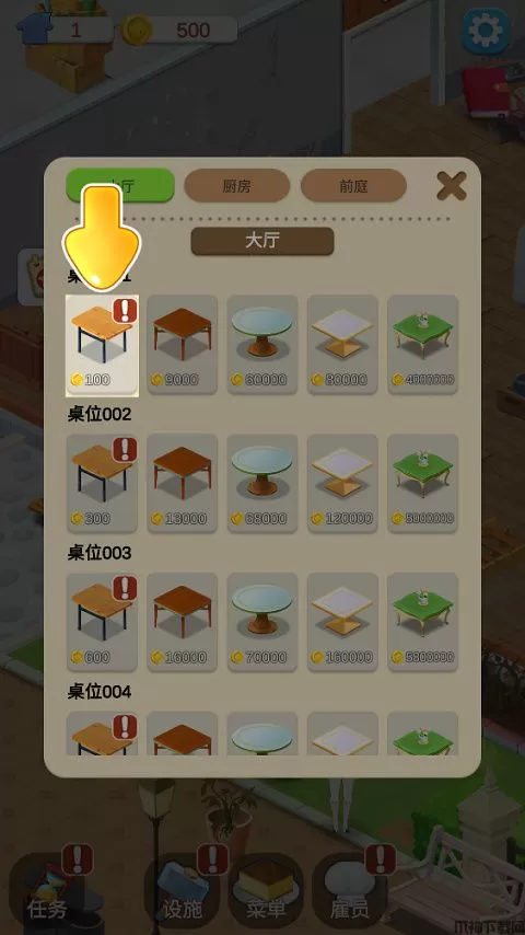 1、首先进入我的甜品店官方版,新店开业,首先为店内布置一些桌椅,点击底部的「设施」,打开面板,选择大厅,在这里选择要购买的桌椅款式。不同设施提供的评分不同,前期由于资金有限,可以先从购买最基础的设施进行布置。